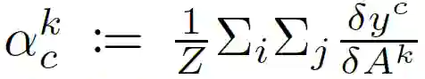作者表示,适合本文目标的方法是 Grad-CAM[9],这是一种模型解释技术,可以识别输入的连续空间区域,而不需要对原始模型进行修改。Grad-CAM 使用网络最后几层计算得到的梯度来计算输入区域的显著性。对于类别 c,Grad-CAM 计算模型输出 y^c 相对于模型最终汇聚层的 k 个特征图 A^k 的梯度(模型对类别 c 的 logit 得分),以得到(δ y^c)/(δ A^k)。每个过滤图的平均梯度值,或 "神经元重要性权重" 记作: