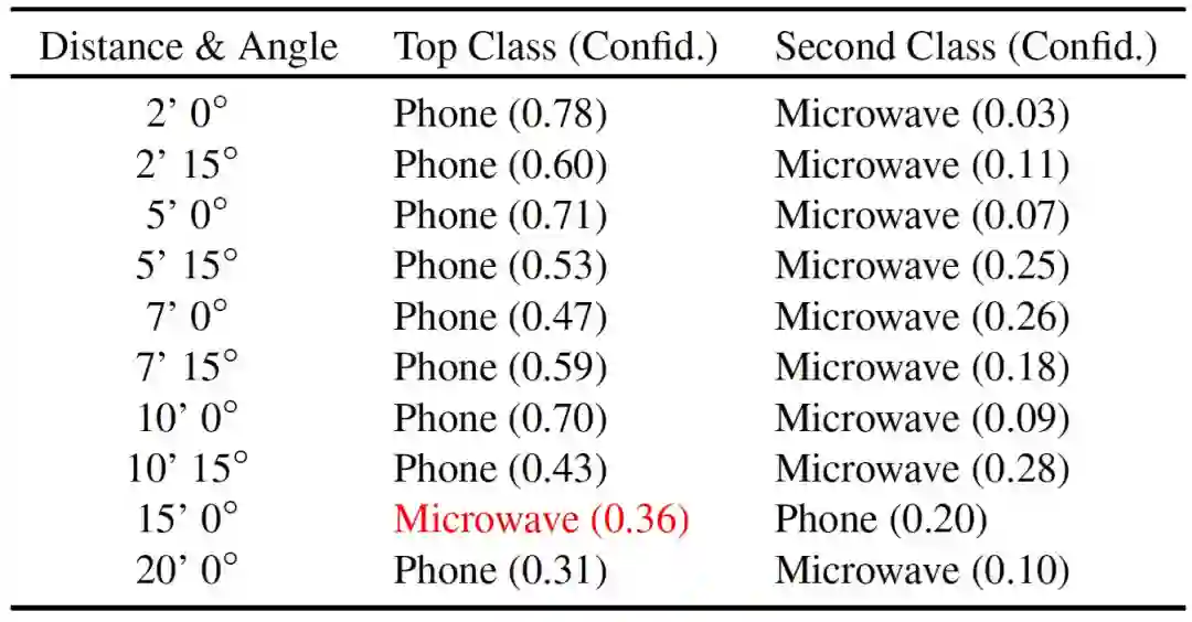 最后,为了证明 RP2 的通用性,作者使用两个不同的物体,一个微波炉和一个咖啡杯,计算了标准 Inception-v3 分类器的物理扰动情况。作者选择了贴纸攻击方法,因为使用海报攻击方法为物体打印一个全新的表面很容易引起人的怀疑。由于杯子和微波炉的尺寸比路标小,作者减少了使用的距离范围(例如,咖啡杯高度 - 11.2 厘米,微波炉高度 - 24 厘米,右转标志高度 - 45 厘米,停止标志 - 76 厘米)。表 5 给出了对微波炉的攻击结果,表 6 则给出了对咖啡杯的攻击结果。对于微波炉,目标攻击的成功率是 90%。对于咖啡杯,目标攻击成功率为 71.4%,非目标成功率为 100%。