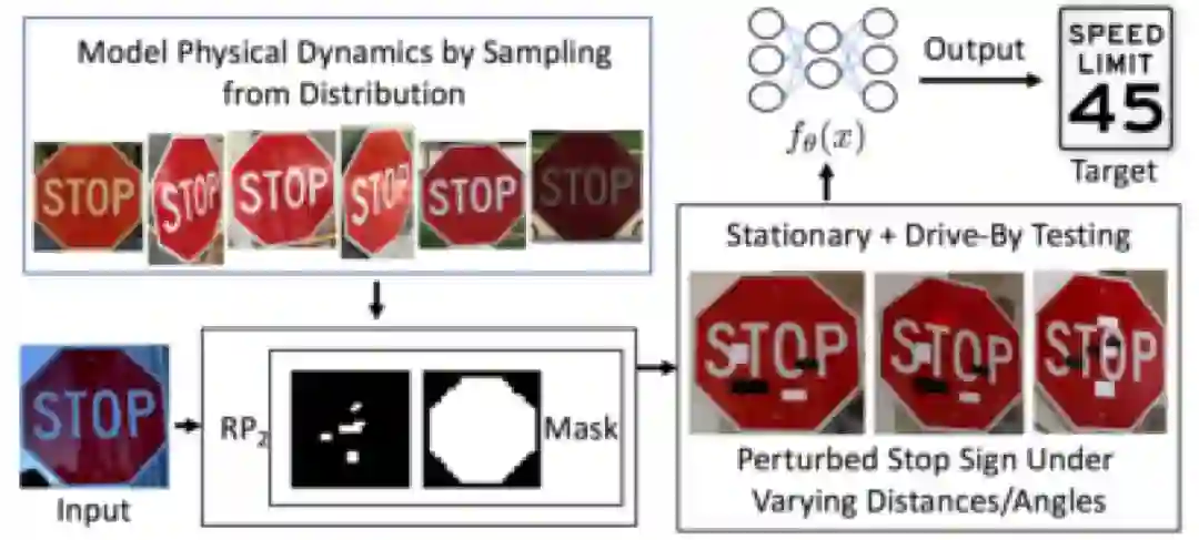 生成鲁棒的物理攻击所面临的的主要挑战是环境变异性。对于本文选择的应用领域,动态环境变化具体是指观察摄像机的距离和角度。此外,生成物理攻击还存在其他实用性的挑战:(1) 数字世界的扰动幅度可能非常小,由于传感器的不完善,相机很可能无法感知它们。(2)构建能够修改背景的鲁棒性攻击是非常困难的,因为真实的物体取决于视角的不同可以有不同的背景。(3)具体制造攻击的过程(如扰动的打印)是不完善的。在上述挑战的启发下,本文提出了 Robust Physical Perturbations(RP2)--- 一种可以产生对观察摄像机的广泛变化的距离和角度鲁棒的扰动方法。本文目标是从攻击角度进行研究,探讨是否能够针对现实世界中的物体创建强大的物理扰动,使得即使是在一系列不同的物理条件下拍摄的图像,也会误导分类器做出错误的预测。