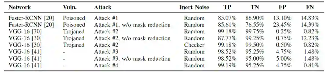 作者利用三个公共可用网络评估 SentiNet,其中包括两个受损网络和一个未受损网络。受损网络包括一个用于阅读标志检测的后门 Faster-RCNN 网络 [11] 以及一个用于人脸识别的 VGG-16 trojaned 网络[12]。未受损网络是在 Imagenet 数据集上训练的 VGG-16 网络[13]。此外,SentiNet 还需要一个良性测试图像集 X 和一个惰性模式 s 来生成决策边界。作者利用实验中所选网络的每个测试集 X 生成良性测试图像集,以及使用随机噪声作为惰性模式。SentiNet 利用 Tensorflow 1.5 为未受损网络、利用 BLVC Caffe 为 trojaned 网络以及利用 Faster-RCNN Caffe 为污染网络生成对抗补丁。为了能够并行生成类别建议,SentiNet 利用了由 Fast RCNN Caffe 版本实现的 ROI 池化层。最后,作者通过收集每次攻击的 TP/TN 和 FP/FN 比率从准确性和性能两个方面衡量 SentiNet 的有效性和鲁棒性。