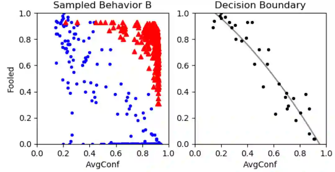 图 12. 边界检测示例,左侧,对抗性和良性指标分别被绘制成红色三角形和蓝色圆圈;右侧,来自采样点的曲线建议