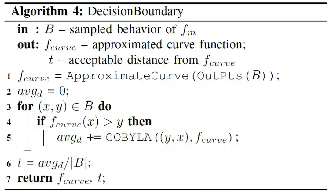 作者提出,可以使用在清洁样本上收集到的度量来近似一个曲线,其中位于曲线函数之外的点可以被归类为对抗性攻击。具体的,通过提取 x 间隔的最高 y 值的点来收集目标点,然后使用非线性最小二乘法函数来拟合生成目标曲线。然后,使用近似曲线计算曲线和点之间的距离(使用线性近似的约束优化(the Constrained Optimization by Linear Approximation,COBYLA)方法)并确定该距离是否在由位于曲线之外的清洁样本的距离所估计的阈值之内,来实现对攻击的分类。具体的边界决策过程如 Algorithm 4 所示。