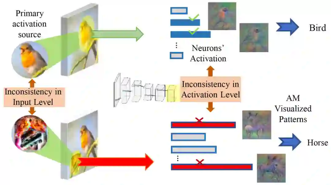 根据上述假设,输入的非语义模式会导致异常的激活,而输入的语义模式会产生正常的激活。作者提出通过调查 CNN 中每个神经元的语义来评估这种差异,并引入一种可视化的