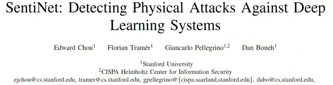 Chou E , F Tramèr, Pellegrino G . SentiNet: Detecting Physical Attacks Against Deep Learning Systems. PrePrint 2020. https://arxiv.org/abs/1812.00292