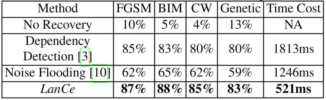 LanCe 对所有的音频物理对抗性攻击都能达到 92% 以上的检测成功率。相比之下,Dependency Detection 平均达到 89% 的检测成功率,而 Multiversion 的平均检测成功率只有 74%。然后,作者评估了 LanCe 的恢复性能。TOP-K 指数中的 K 值被设定为 6。由于 Multiversion[9]不能用于恢复,作者重新实现了另一种方法 Noise Flooding[10]作为比较。作者使用没有数据恢复的原始 CNN 模型作为基线方法。