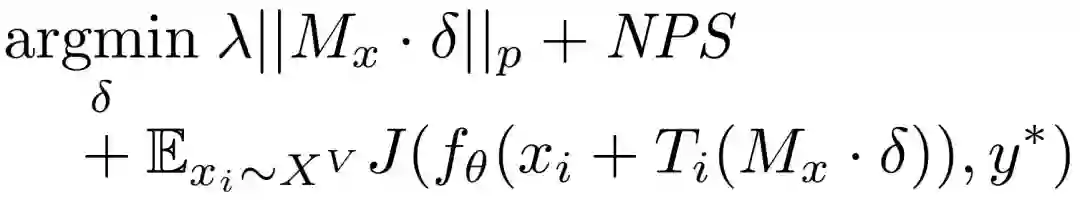 考虑到在实际应用中会存在制造误差,作者在目标函数中增加了一个额外的项,该项用来模拟打印机的颜色复制误差。给定一组可打印的颜色(RGB 三元组)P 和一组在扰动中使用的、需要在物理世界中打印出来的(唯一的)RGB 三元组 R(δ),利用下式计算不可打印性得分 non-printability score (NPS):