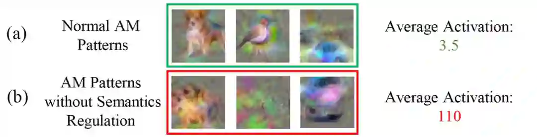 图 4 展示了使用 AM 的可视化输入的语义模式。由于原始的 AM 方法是为语义解释而设计的,在生成可解释的可视化模式时,涉及许多特征规定和手工设计的自然图像参考。因此,我们可以得到图 4(a)中平均激活幅度值为 3.5 的三个 AM 模式。这三种模式中的对象表明它们有明确的语义。然而,当我们在 AM 过程中去除这些语义规定时,我们得到了三种不同的可视化 patterns,如图 4(b)所示。我们可以发现,这三个 patterns 是非语义性的,但它们有明显的异常激活,平均幅值为 110。这一现象可以证明作者的假设,即