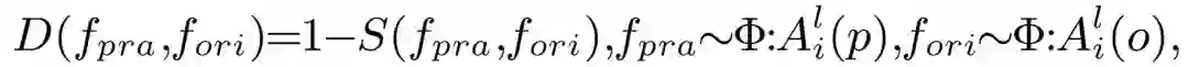 其中,P_pra 和 P_ori 分别代表来自对抗性输入和原始输入的输入模式(input patterns)。Φ:(A_i)^l(p)和Φ:(A_i)^l(o)分别表征由对抗性补丁和原始输入产生的神经元激活的集合。R 将神经元的激活映射到主要的局部输入模式。S 代表相似性指标。