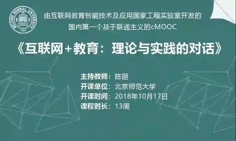 《互联网+教育:理论与实践的对话》是由北京师范大学陈丽教授主持、互联网教育智能技术与应用国家工程实验室联合开发的,基于联通主义理论的cMOOC课程。课程以“开放”、“共享”、“互动”、“创新”为指导,关注互联网推动教育创新的实践策略和创新理论,旨在帮助所有参与者建立起个人与典型创新企业、研究机构、关键人物、文献资源之间的连接,形成互联网教育领域的社会联通网络,并最终建构出包括研究者、企业创新实践者、管理人员在内的互联网教育领域的综合性高端研究社区。本课程共13周,将结合互联网推动教育变革的典型趋势,围绕“互联网+教育”创新的5个专题,以及3次学术研讨,邀请国内互联网教育领域的代表性创新企业,以及这个领域的专家、学者和管理人员与各位一起共同探讨、共建内容。