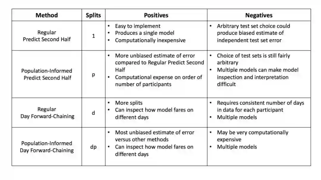 最后,我们总结了不同嵌套交叉验证方法的优缺点,特别是独立测试集误差估计的计算时间和偏差。分割的次数假定数据集包含 p 个参与者,以及每个参与者共有 d 天的数据。