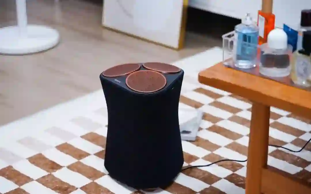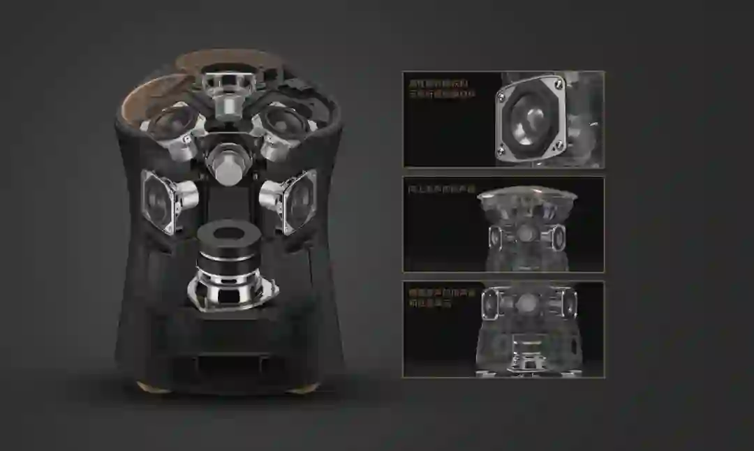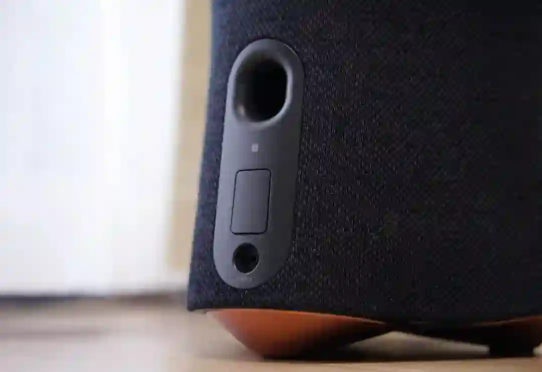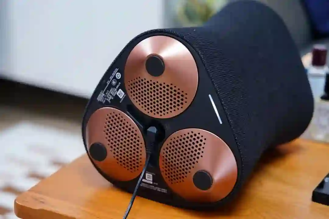实现充满房间的环绕声的秘密,得归功于机身内拥有的 7 个发声单元,分别是顶部 3 个 46mm 全频扬声器,侧面 3 个 46mm 全频扬声器以及 1 个 70mm 低频单元,底部还有留有低音开孔。