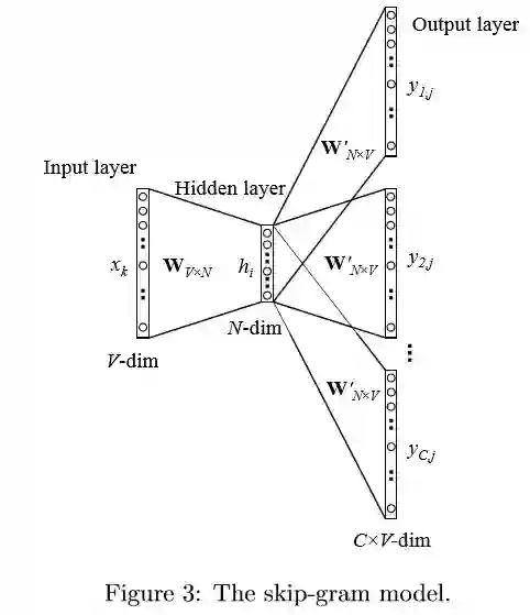 Skip-gram模型是由Mikolov等人提出的。下图展示了Skip-gram模型的过程。该模型可以看做是CBOW模型的逆过程,CBOW模型的目标单词在该模型中作为输入,上下文则作为输出。