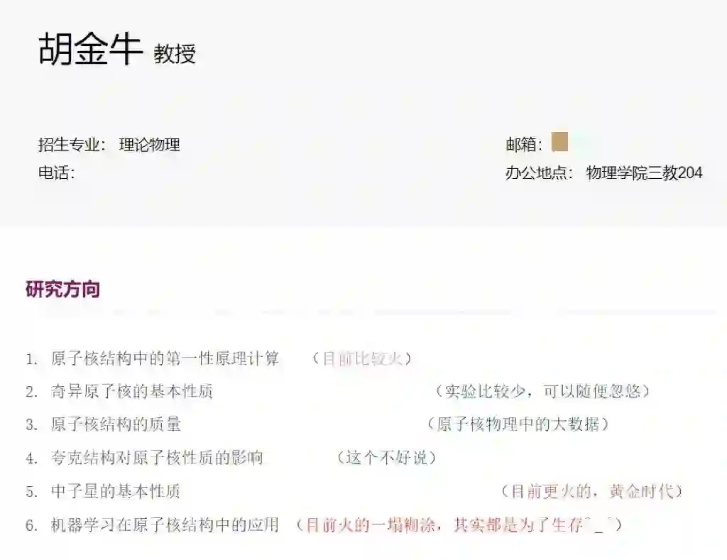 在个人简介方面,胡教授会在一长串的学业研究经历后补充:“主要是当时找不到工作”,在提到目前担任中国核物理学会理事时,他会谦虚表示“承蒙各位前辈大佬支持” ……