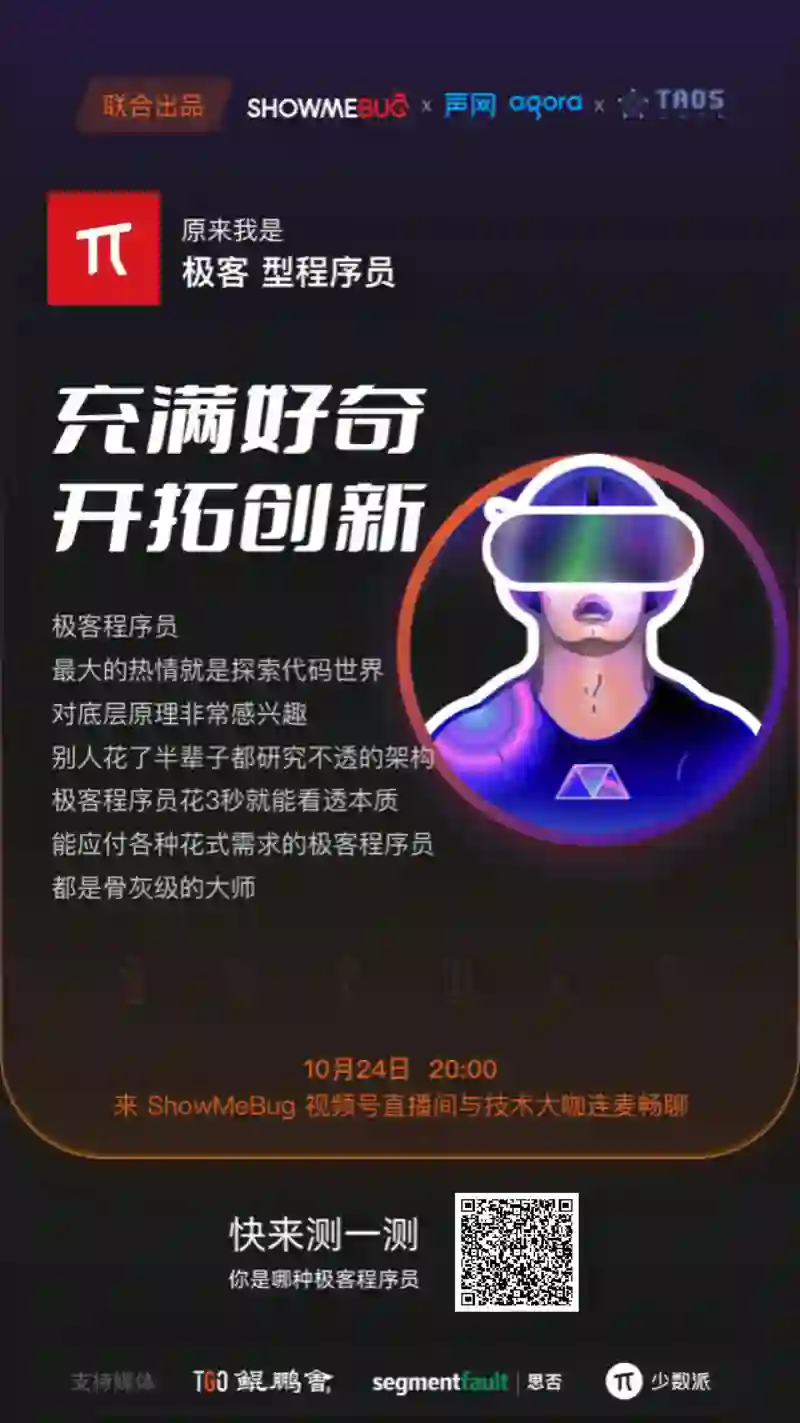 1024 程序员节 我们向所有极客精神的程序员致敬 他们桀骜不驯或谦卑内敛 他们沉浸在代码世界中 善于用不同角度去思考 既不墨守成规,也不安于现状 他们拥有分享精神 正因为他们大爱着这个世界 敲透代码只是表象 改变世界才是梦想
