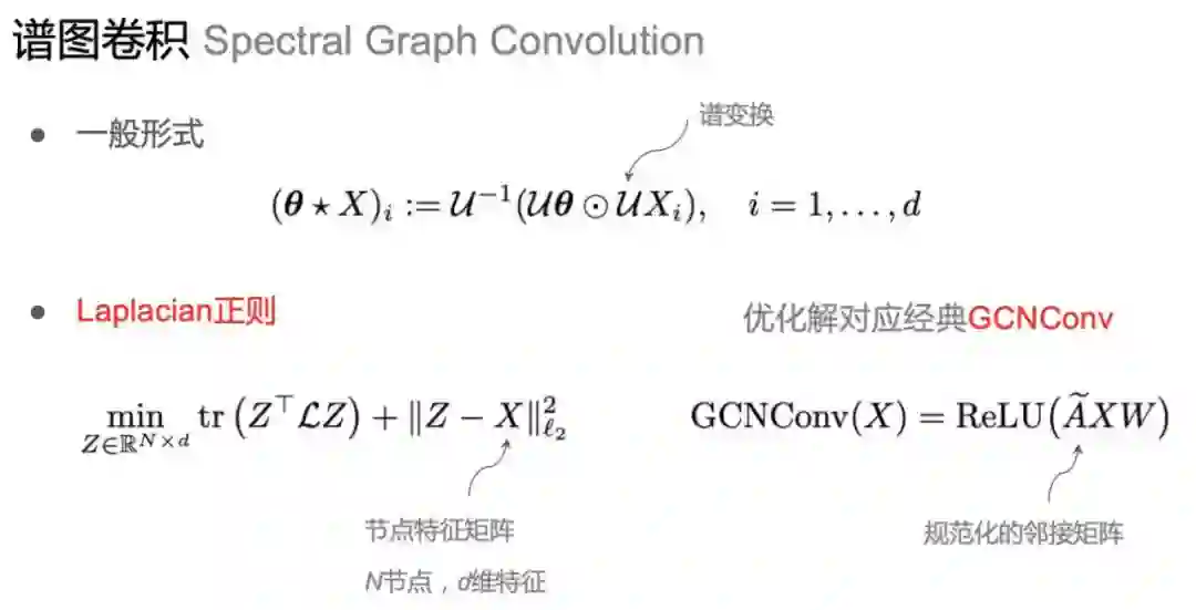 图神经网络特征提取模块可以写成图卷积的模式,与传统的 CNN 卷积类似,只不过在图上定义卷积不如 CNN 直观,不能用空间域窗口的方式平移得到,但是可以仿照傅里叶卷积的模式,定义图卷积的模块。这种卷积被证明和传统 CNN 具有相似的特征提取功能,共享了参数,并保持了重要的图结构性质,从而在图神经网络的学习中起到了很好的特征提取作用。其中一个很重要的模块是由谱图神经网络衍生出来的经典 GCN 模型,如果写成谱图的形式就是 Laplacian 正则化的过程。