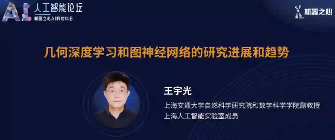 3 月 23 日,在机器之心 AI 科技年会上,上海交通大学自然科学研究院和数学科学学院副教授、上海人工智能实验室成员王宇光老师发表了主题演讲《几何深度学习和图神经网络的研究进展和趋势》。