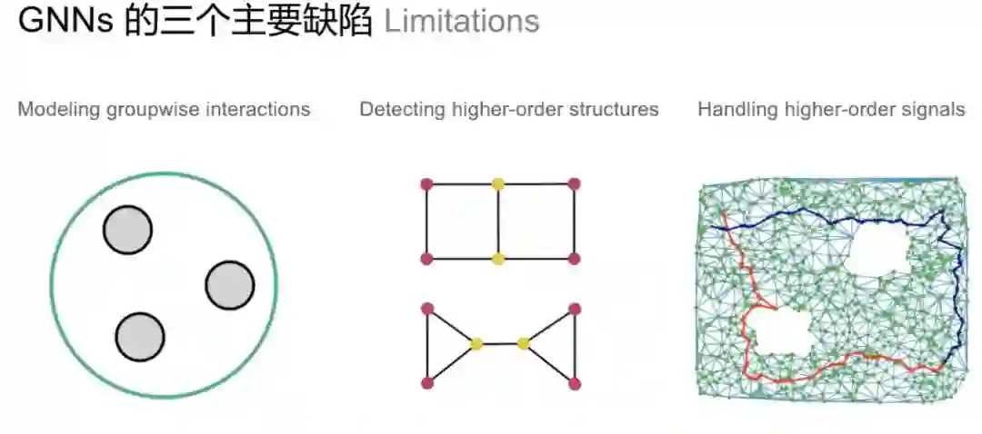 人们又考虑是不是能够在图学习中利用更多的拓扑信息或结构信息,因此就导出了一种超越神经网络的单纯复形网络的消息传递模式,主要克服了图神经网络的三个缺陷。第一是图神经网络在建模多个节点相互作用的时候并没有那么有效;第二是在检测高阶结构(比如二阶拓扑结构)时,图神经网络由于只考虑了关系,即连接节点的边而并没有考虑环或者面的信息和特征,因此 GNN 不能完成高阶任务;第三是不能有效地处理高阶信号,例如预测从某一点到另一点的轨迹信息。