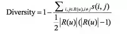 而推荐系统的整体多样性可以定义为所有用户推荐列表多样性的平均值: