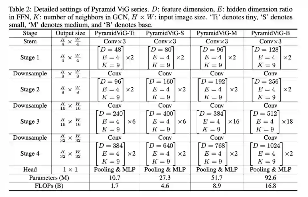 金字塔架构考虑了图像的多尺度特性,即随着层越深提取空间尺寸越小的特征,如 ResNet 和 PVT。经验证据表明,金字塔结构对视觉任务是有效的。因此,本文利用先进的设计和建立了四个版本的金字塔 ViG 模型。