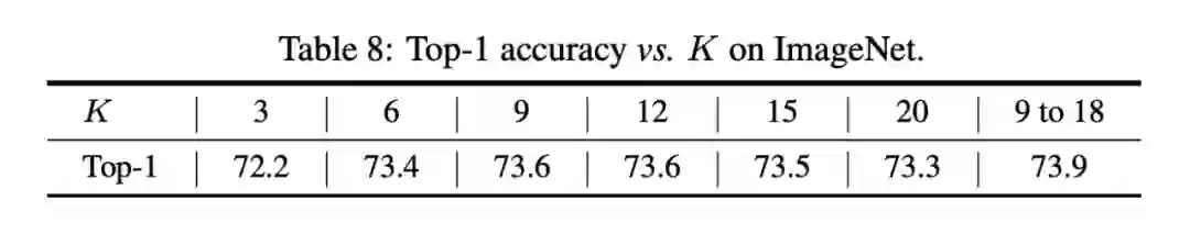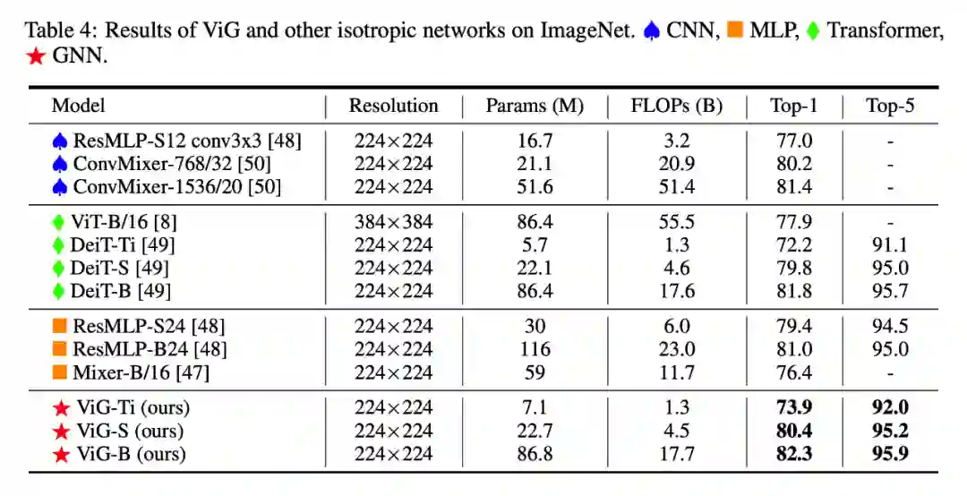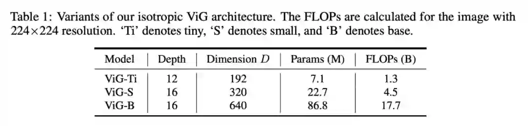 各向同性架构意味着主体在整个网络中具有大小和形状相同的特征,如 ViT 和 ResMLP。本文构建了三种不同模型尺寸的各向同性 ViG 架构,分别为 ViG-ti、S 和 B,节点数设为 N =196。为了逐渐扩大接收场,这三种模型中随着层深的增加,邻居节点数 K 从 9 线性增加到 18。头的数量默认设置为 h = 4。