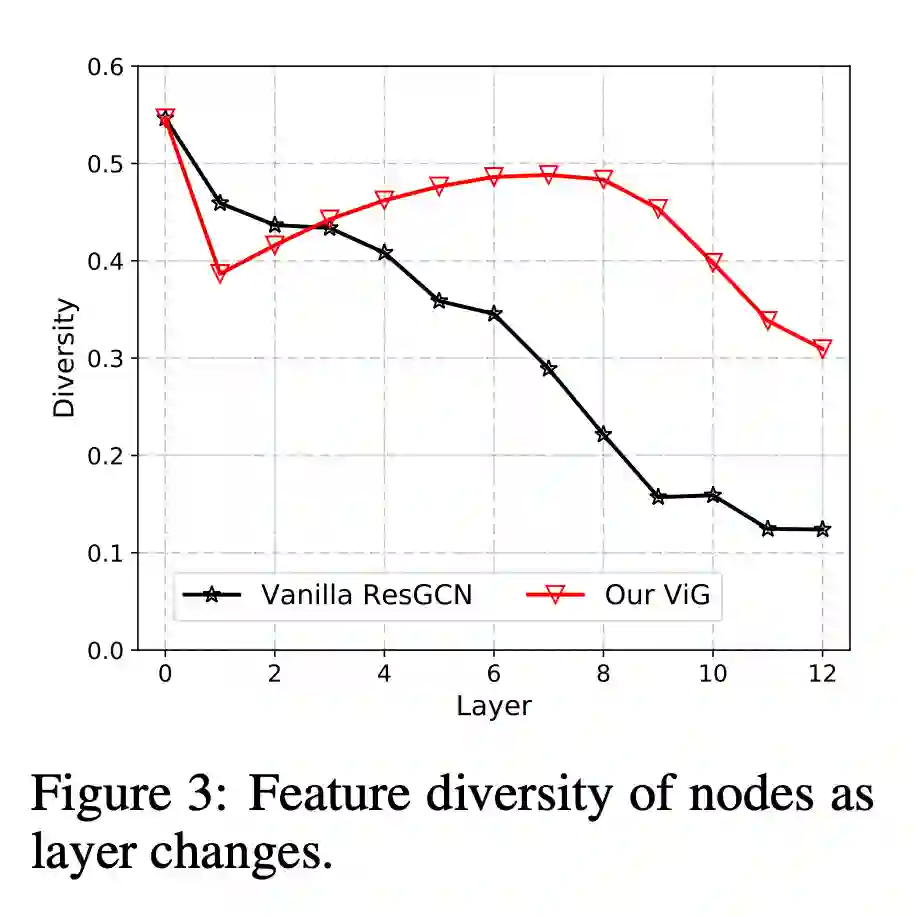 由 Grapher 模块和 FFN 模块叠加而成的 ViG 块是构成网络的基本构建单元。因此构建面向视觉任务的 ViG 网络。与 ResGCN 相比,ViG 随着层的深入能够保持特征多样性,学习出判别性的表征。