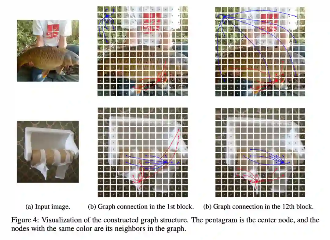 为了更好地理解 ViG 模型是如何工作的,在 v - s 中可视化构造的图结构。在上图中,展示了两个不同深度的样本的图形(第 1 块和第 12 块)。五角星是中心节点,相同颜色的节点是它的邻居。两个中心节点被可视化为绘制所有的边将是混乱的。可以观察到,提出的模型可以选择与内容相关的节点作为一阶邻居。