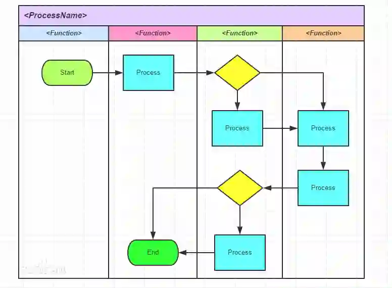 部门级流程:展现岗位间的协作,以具体岗位为泳道/职能带区,与部门协作无关。