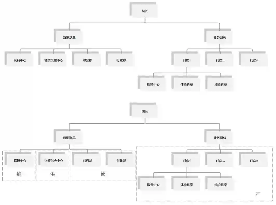 在划分之前,可以先绘制出与其相关的组织架构图,然后根据组织/部门之间的关系,划分出各个业务子模块即可,部门职能最典型的是产(生产/产出)、销(销售)、供(供给/供应)、管(管理)四部分。