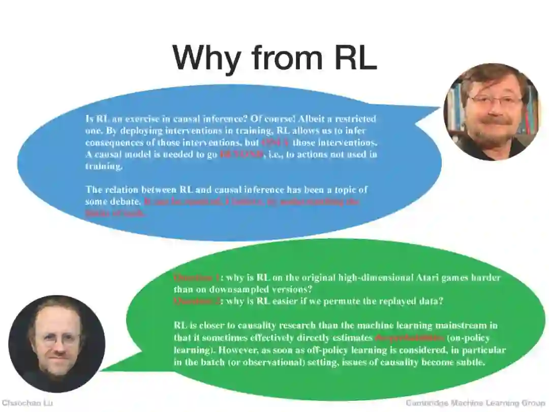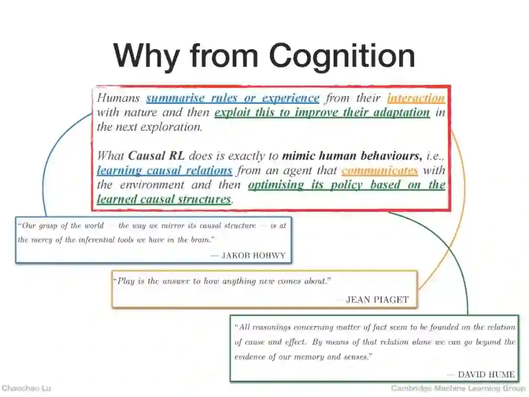 来自剑桥大学的陆超超博士生讲述《因果强化学习》,人类从与自然的互动中总结规则或经验,然后利用这些来提高他们在下一次探索中的适应能力。因果强化学习所做的就是模仿人类的行为,即从与环境沟通的agent那里学习因果关系,然后根据所学到的因果结构来优化策略。