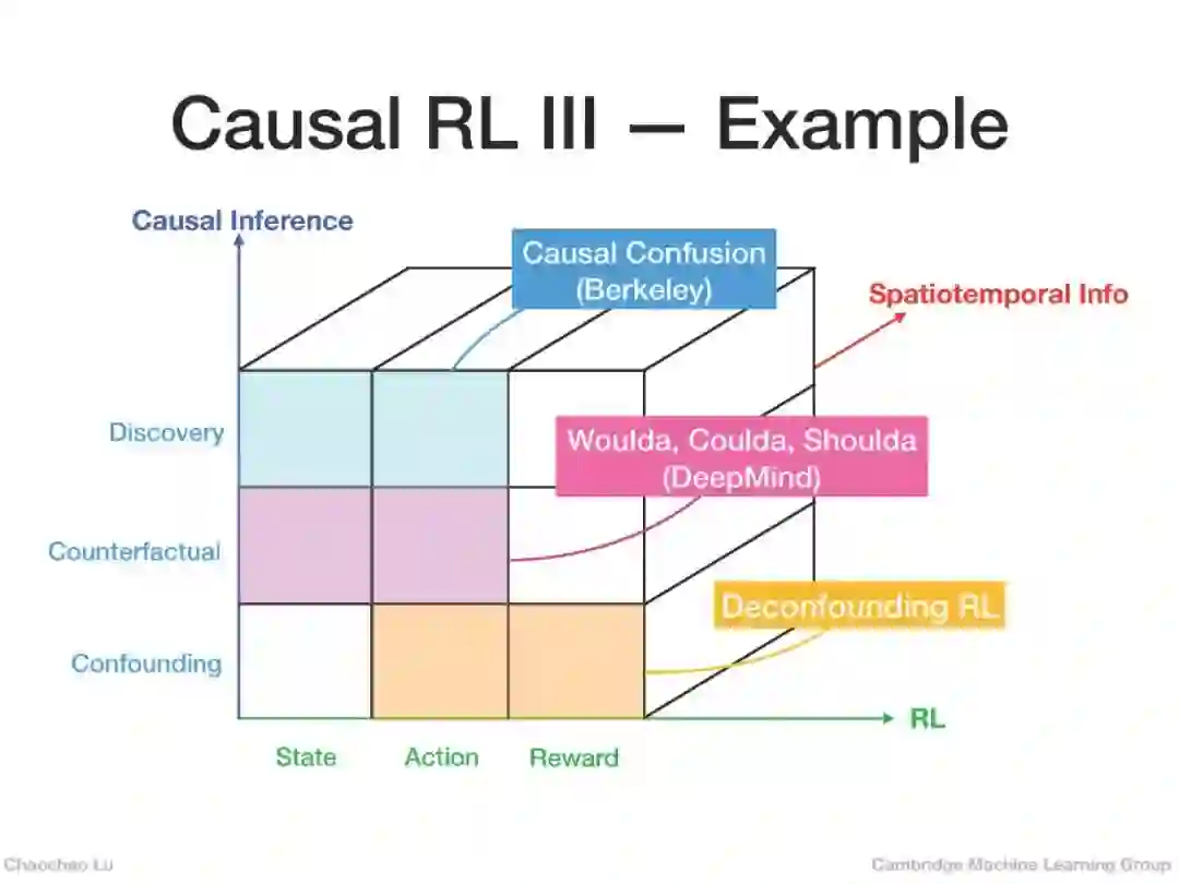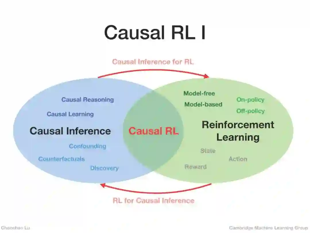 在因果推理中实施干预概念的一个自然想法是利用RL中的动作概念[17,2]。更具体地说,agent可以根据其当前状态,通过采取不同的行动(干预)来观察环境状态的变化,并获得即时的回报(结果)。然而,agent的目标是最大化预期累积报酬,这表明RL本身不具备进行因果推理的能力。因此,因果推理通过推断状态之间或状态与动作之间的因果关系,如减少状态或动作空间,处理混淆,进而帮助RL更高效、更有效地学习价值函数或策略。可见因果关系与强化学习是互补的,可以从因果关系的角度加以整合,从而促进两者的发展。
