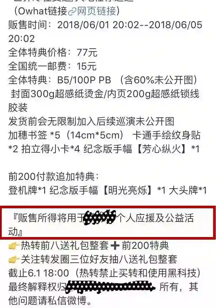 一种是线下演出的应援物。每当自家爱豆要参加音乐节、综艺节目录制、见面会等线下场合时,部分粉丝、站子、后援会会根据爱豆近期的照片进行设计,排版制作手幅、小卡、明信片等在场馆门口进行免费分发。对于粉丝来说,“无偿”地为爱豆制作应援物品,也是对偶像爱意的一种体现。当然,这种“分发”虽然是免费的,但需要满足一定的条件。“一般是要求微博超话超过一定的等级,杂志、代言、专辑的购买记录等等。”近期刚在演唱会现场发完手幅的小F告诉毒眸,在开始分发手幅的半小时内,就被满足条件的粉丝们“一抢而空”。