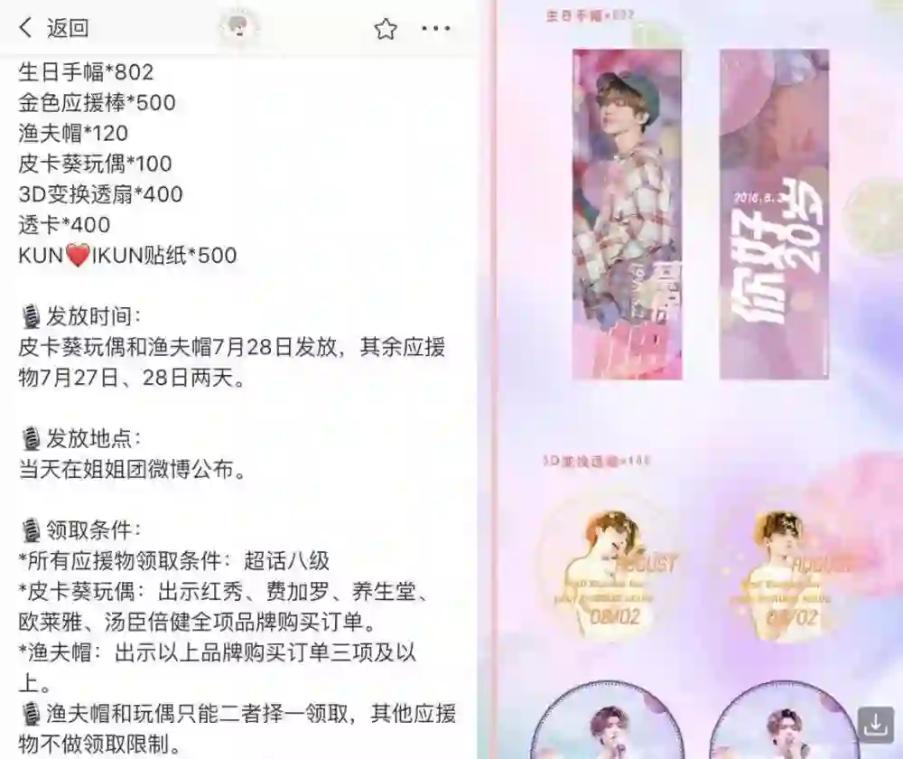 不过,如果说线下免费分发的手幅、租借的灯牌等大多都是生产厂家获利的话,粉丝真正可以获取收益的部分还是线上售卖的偶像衍生品。