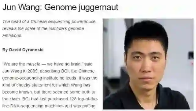 2012年,青年科学家、时任中国华大基因CEO的王俊上榜。《自然》杂志援引哈佛大学遗传学家乔治?洽奇的评价说,1999年,华大基因支持了人类基因组计划的1%,而在2012年,华大的基因测序能力,让其在世界基因测序上的贡献超出了50%。