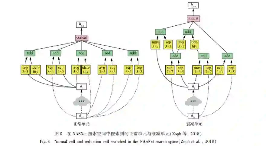 深度神经网络之所以能取得很好的性能,很大 程度上是由于优秀的网络结构设计。神经网络的设 计需要考虑很多因素。以卷积神经网络为例,需要 根据目标数据集来决定使用多少层的卷积神经网 络。比如 ResNet(He 等,2016)有 18 层、34 层、152 层 等不同版本,需要在准确率和计算量之间进行权衡。例如在较大的数据集上使用 ResNet-18 ( He 等, 2016)可能会出现拟合能力较差的情况;在较小的 数据集上使用 ResNet-152(He 等,2016)则很可能会 过拟合,并且增大算力开销。除了层数之外还需要 考虑卷积核的大小,如果全部使用 3 × 3 大小的卷积 核,那么层数较少的情况下感知野会比较小,如果全 部使用 7 × 7 大小的卷积核,算力要求会呈倍数增 长。需要仔细权衡在哪些层使用 3 × 3 大小的卷积 核,在哪些层使用 5 × 5 或者 7 × 7 大小的卷积核,既 要保证获得足够大的感知野,又不会使得计算量过 大而无法训练到收敛;另外还需要考虑在哪些层进 行下采样(downsample),是否使用最大池化层(max pooling)、平均池化层(average pooling),或者使用步 长(stride)大于 1 的卷积层进行下采样;在 ResNet (He 等,2016)证实残差学习(residual learning)能够 极大地改善深度神经网络的收敛结果之后,还需要 考虑不同的网络层之间的连接方式。从 2014 年 VGGNet(Simonyan 和 Zisserman,2014)的线性结构, Inception ( Szegedy 等, 2015, 2016, 2017; Ioffe 和 Szegedy,2015 ) 网络的多路结构设计, 到 2016 年 ResNet ( He 等, 2016 ) 的 残 差 连 接 和 2017 年 DenseNet(Huang 等,2017) 的密集连接,再到 2017 年 SENet(Hu 等,2018)中注意力机制( attention)的 加入,神经网络结构的设计变得愈发复杂,不再是简 单的线性结构的设计,而是有向无环图( directed acyclic graph)的设计,这使得在特定场景下,设计兼 顾性能和计算量的神经网络变得愈发困难。