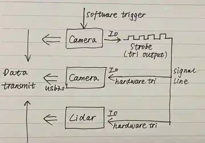 对于软触发+硬触发来说,可以先用相机SDK的API对一个相机进行软触发,然后利用相机的外触发信号Strobe对雷达和相机等其他传感器进行硬触发。
