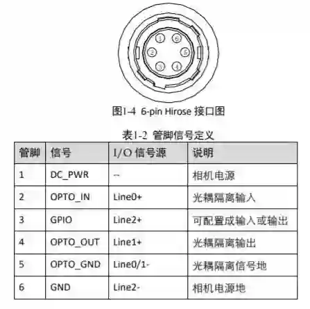 硬件触发:外部设备通过相机的 I/O 接口与相机进行连接,触发脉冲信号由外部设备给到相机进行采图。其实是直接对相机内部寄存器进行读写。下图是海康相机的电源IO的6-pin线缆: