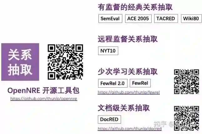 我们课题组从2016年开始耕耘实体关系抽取任务,先后有林衍凯、韩旭、姚远、曾文远、张正彦、朱昊、于鹏飞、于志竟成、高天宇、王晓智、吴睿东等同学在多方面开展了研究工作。去年在韩旭和高天宇等同学的努力下,发布了OpenNRE工具包 [33],经过近两年来的不断改进,涵盖有监督关系抽取、远程监督关系抽取、少次学习关系抽取和文档级关系抽取等丰富场景。此外,也花费大量科研经费标注了FewRel (1.0和2.0)和DocRED等数据集,旨在推动相关方向的研究。