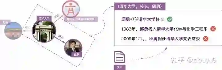 远程监督的思想并不复杂,具体来说:如果两个实体在知识图谱中被标记为某个关系,那么我们就认为同时包含这两个实体的所有句子也在表达这种关系。再以(清华大学,位于,北京)为例,我们会把同时包含“清华大学”和“北京”两个实体的所有句子,都视为“位于”这个关系的训练样例。
