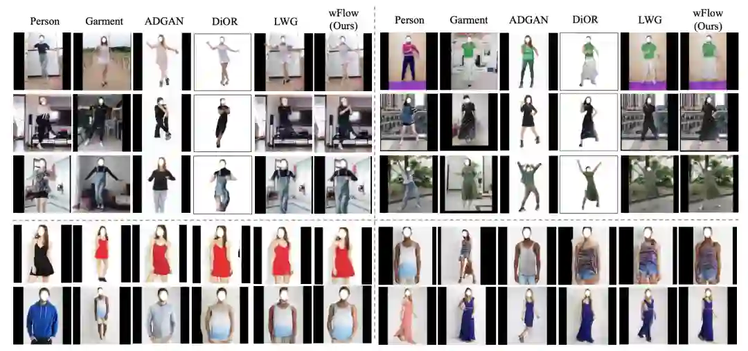具体来说,2D 像素流负责构建衣物图片与人体分割图之间的纹理映射关系,其对图片层面的空间结构特征敏感但无法复现潜在 3D 人体的刚性变换,通过进一步引入基于 SMPL 人体 3D 模型的顶点流,通用复合外观流 wFlow 相较现有工作的单一外观流具备更强的三维感知力,同时不丢失了对目标衣服完整 2D 空间结构的保留能力,下图展示了 wFlow 与其他 SOTA 虚拟试穿方法的对比结果。