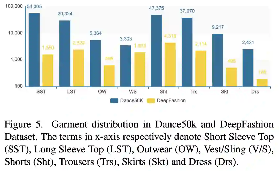 论文中,火山引擎新提出的大规模视频数据 Dance50k 相较现有被广泛使用的 DeepFashion 数据集在衣服种类及图片数量上均有大幅提升(见下图)。
