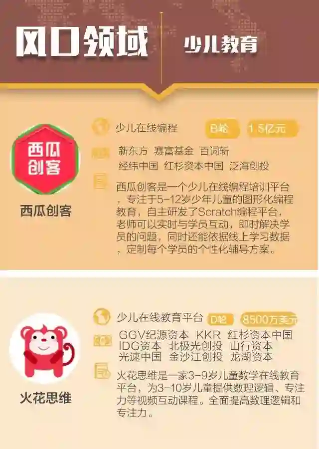 上周的风口行业为少儿教育,其中最值得关注的项目为西瓜创客和火花思维,西瓜创客是一个少儿在线编程培训平台,专注于5-12岁少年儿童的图形化编程教育,自主研发了Scratch编程平台,老师可以实时与学员互动,即时解决学员的问题,同时还能依据线上学习数据,定制每个学员的个性化辅导方案。火花思维是一家3-9岁儿童数学在线教育平台,为3-10岁儿童提供数理逻辑、专注力等视频互动课程,全面提高数理逻辑和专注力。