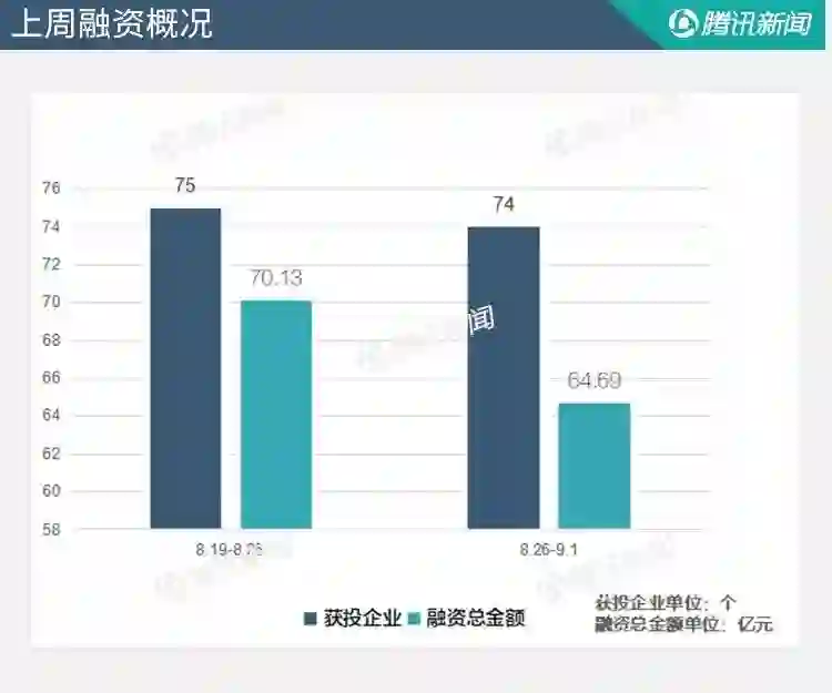 上周国内共发生了74起投融资事件,累计金额超过64.69亿人民币,获投项目数量和融资总金额双双下降。