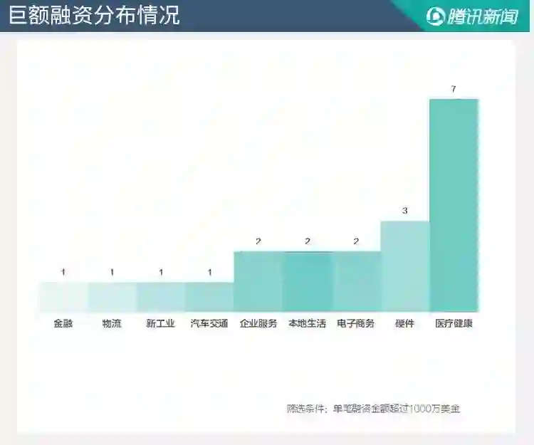 单笔融资金额超过1000万美金的融资事件共有20个,主要集中在医疗健康领域,其次为硬件领域。