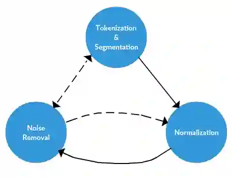 正如你所认为的,噪声消除和数据收集之间的界线很模糊,由于噪声消除与其他步骤联系紧密,因此它必须在其他步骤之前进行。例如,从JSON结构中获取的文本显然要在标记化之前消除噪音。