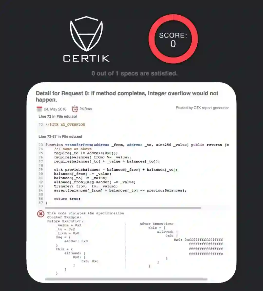 我们只需要将这段代码提交到CertiK的验证引擎,CertiK就能够在24.9ms内一键检测到EDU的安全漏洞。如果EDU的智能合约在提交之前能够利用CertiK做代码检查,那么这些损失是完全可以被避免的。