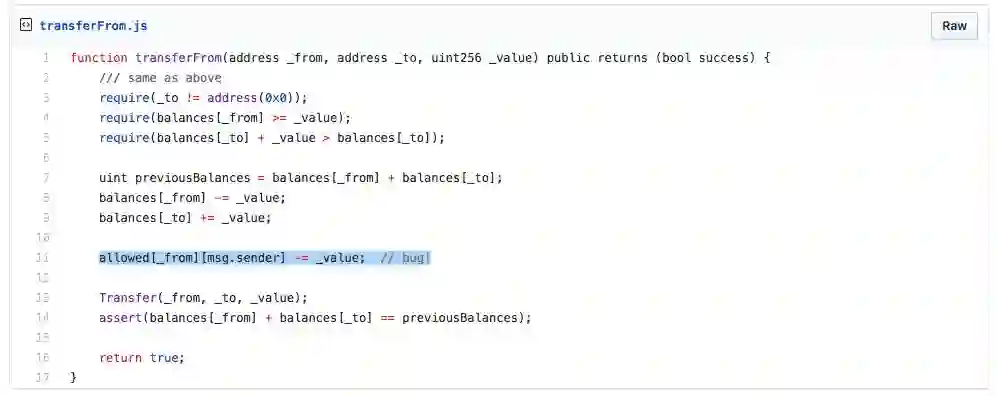这个安全漏洞其实非常容易被检测!EDU智能合约中一transferFrom函数, 主要目的是实现EDU的转账: 将一定数量(_value)的EDU从源地址(_from)转账到接收地址 (_to):