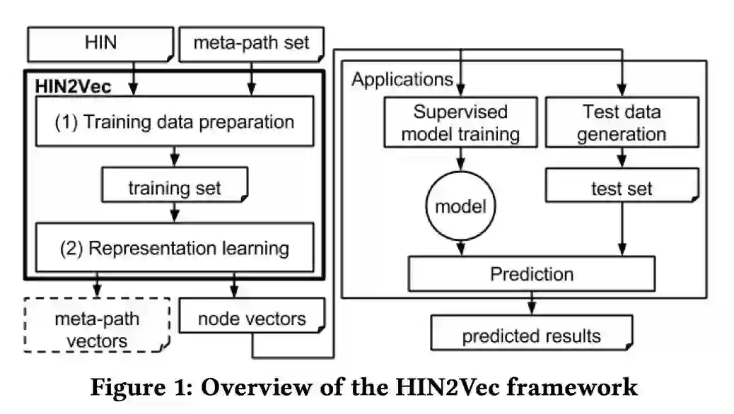 提出了 HIN2Vec 模型,包括两部分:首先,基于随机游走和负采样生成训练数据,然后,设计逻辑二元分类器用于预测两个给定的节点是否存在特定的关系。同时,考虑了循环序列、负采样和正则化问题。