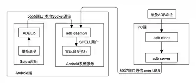 在 PC 上,通过 Android SDK 提供的ADB client 与同样运行于 PC 中的 ADB server 通信,再由 ADB server 通过 USB 与位于设备中的 Adbd 通信。要实现一套无线化的方案,必须要摆脱对 USB 线的依赖。好在 Android 系统还提供了一种基于 Socket 的 ADB 连接模式,既然是这样,那么只需要按照 ADB 通信协议在端上与本机的 5555 端口进行通信即可获得 ADB shell 的执行能力。