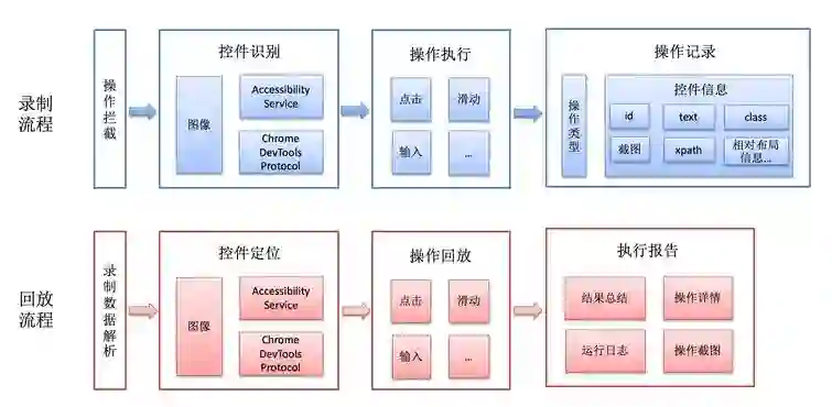 录制回放功能基于 AccessibilityService、ChromeDevToolsProtocol、图像识别三种模式实现精确查找,可以在设备本地实现回放,也可以转换为 Appium/Macaca 等框架的脚本,对接云测平台。另外,为了降低用例维护的成本,我们在端上还提供了用例编辑、流程控制的功能。