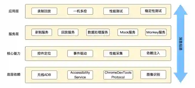 这套方案中,底层依赖主要是“无线 ADB、系统辅助功能、Chrome 调试以及图像识别技术”,后文将会介绍它们具体的应用场景。同时,在底层依赖的基础上,我们封装了一套核心能力,由“控件定位、事件驱动、性能采集以及依赖注入”组成,并在服务层实现了录制、回放、数据处理等公共服务能力。在架构的最顶端,结合界面交互逻辑包装出了各个功能的入口。